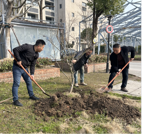 植樹現場,大家干勁十足,揮鍬挖土、鋪設草坪、培土灑水,用心種下每一顆新苗,以實際行動踐行“綠水青山就是青山銀山”的生態文明理念,為良友紅坊園區增添了一片生機勃勃的綠色。