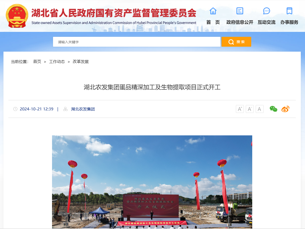 湖北省國(guó)資委:湖北農(nóng)發(fā)集團(tuán)蛋品精深加工及生物提取項(xiàng)目正式開(kāi)工
